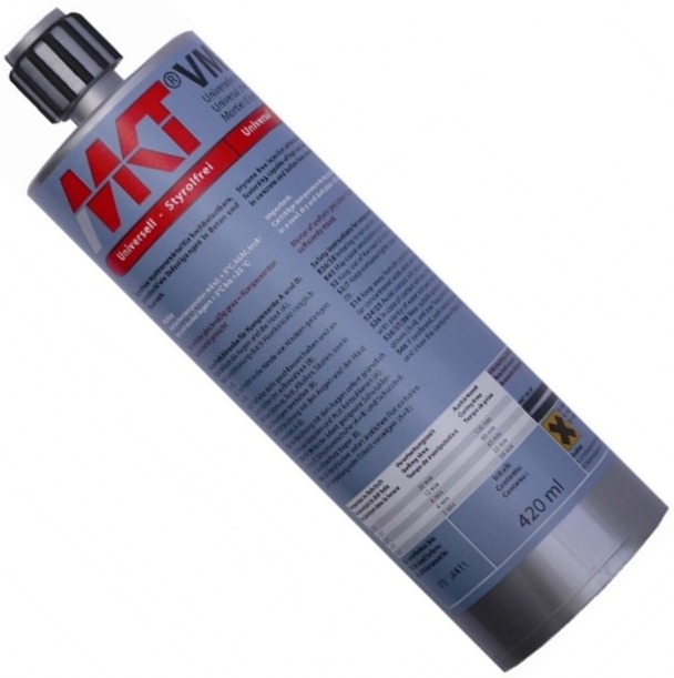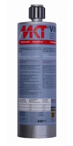 Картридж MKT VMU 410 предназначен для создания особо прочных креплений по технологии инъецирования VMU. В данной серии расходных материалов для химической анкеровки это картридж наибольшего объема: 420мл. Химический состав включает два компонента: винилэстеровую смолу и отвердитель. За счет отсутствия в составе стирола использование технологии возможно даже в помещениях (при работе отсутствует запах). Поставляется в комплекте с двумя смесителями. Совместно с картриджем используются шпильки или арматура.