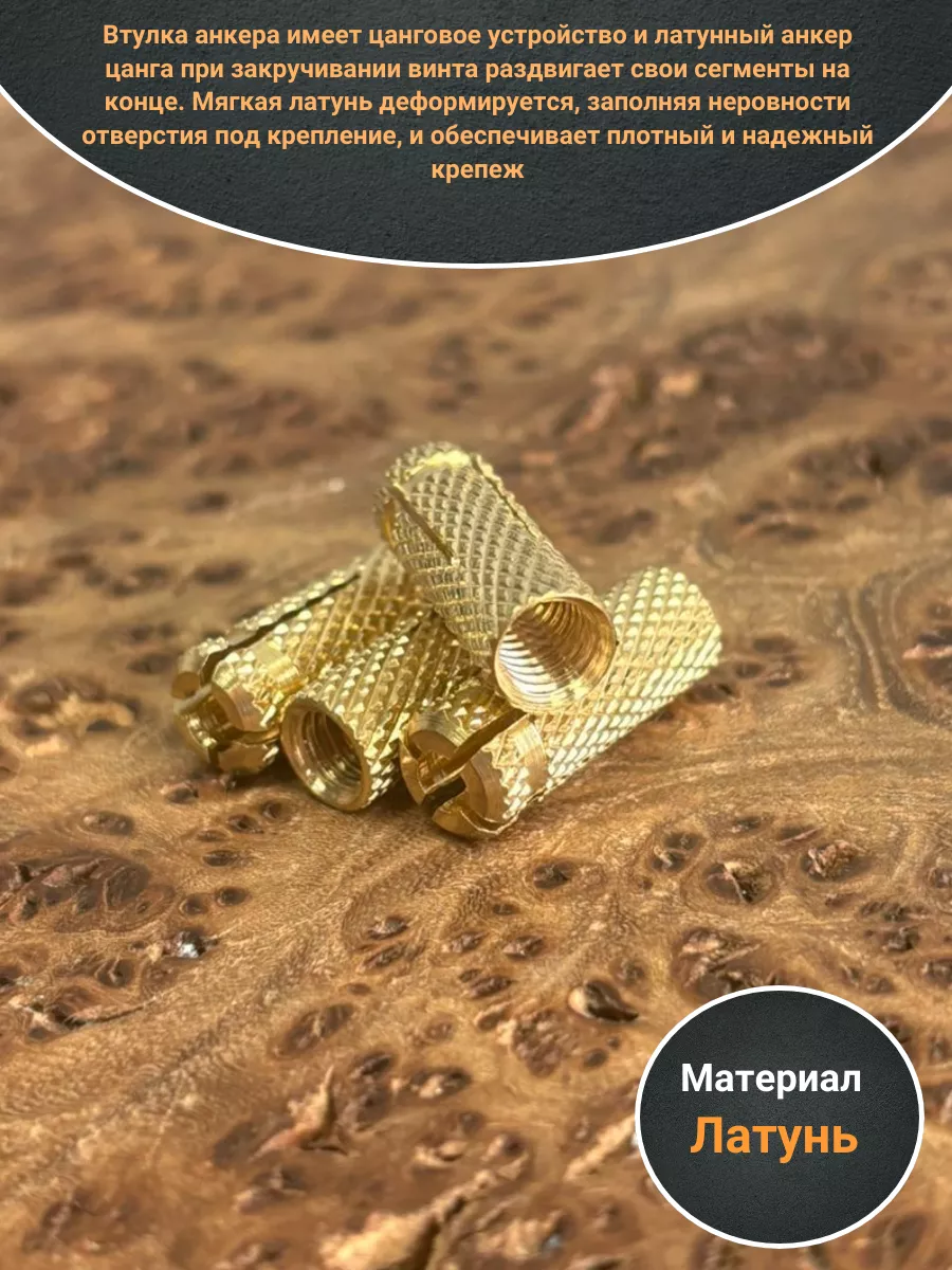 Представляет собой простейшую и надежную конструкцию. Это небольшая втулка из латуни покрытая нарезкой для лучшего сцепления со стеной. Та часть, которая расположена в глубине отверстия, имеет деление на четыре сегмента. Эти сегменты предназначены для обеспечения надежного распора и крепления в теле стены.