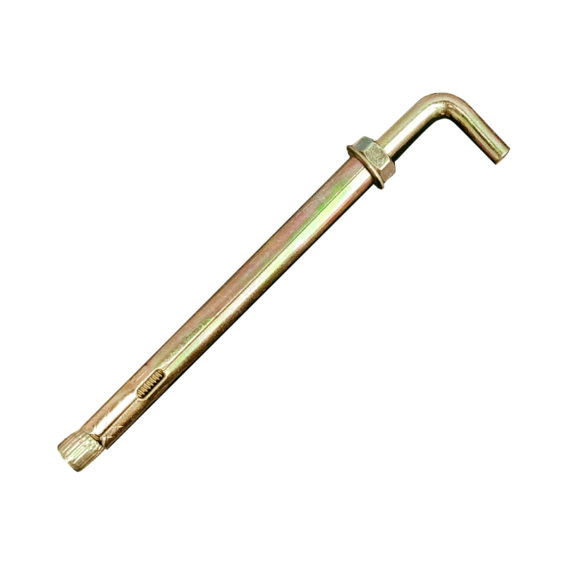 Анкерный болт с Г-образным так же называется "костыль", вместо шестигранной головки. При закручивании гайка подтягивает стержень, после чего конусообразный наконечник входит внутрь втулки и распирает ее, прижимая к стенкам отверстия. Используют для крепления в бетоне, камне, полнотелом кирпиче: радиаторов отопления, подвесных сооружений, строительных лесов. Используют для крепления тяжеловесных изделий к вертикальным поверхностям как высококачественная сталь для высоких вырывных нагрузок. Отлично держит нагрузку как в вертикальном, так и в горизонтальном положении крепления. Для затягивания анкерной гайки используется ключ или головка. Также анкер позволяет изменять высоту собранного с его помощью оборудования, конструкции и т.д. Обеспечивает возможность легкой регулировки уровня возникающих напряжений в конструкции в течение нескольких лет после монтажа. Стандартный анкер гайка является самым надежным и распространенным видом крепежа по бетону и кирпичу.
