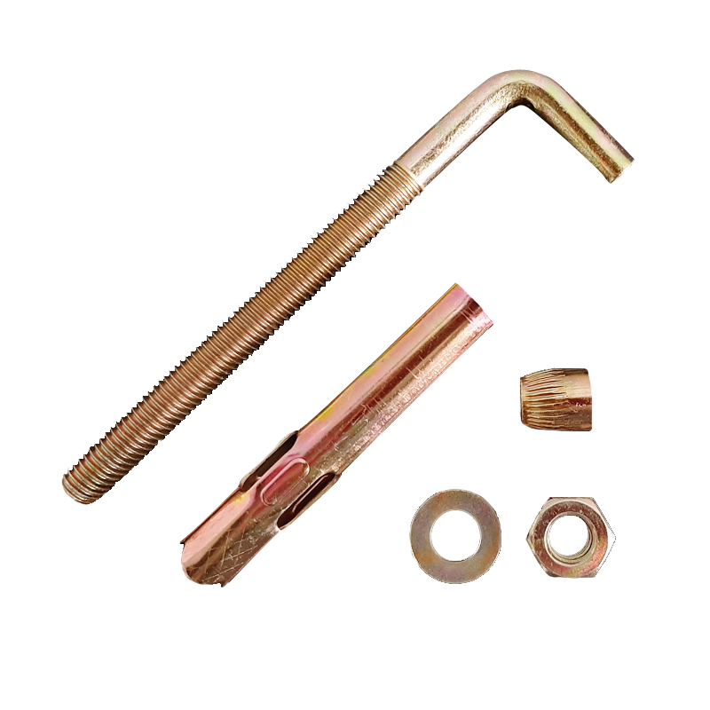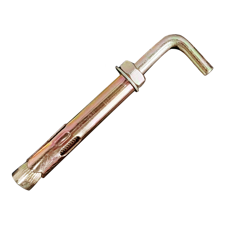 Анкерный болт с Г-образным так же называется "костыль", вместо шестигранной головки. При закручивании гайка подтягивает стержень, после чего конусообразный наконечник входит внутрь втулки и распирает ее, прижимая к стенкам отверстия. Используют для крепления в бетоне, камне, полнотелом кирпиче: радиаторов отопления, подвесных сооружений, строительных лесов. Используют для крепления тяжеловесных изделий к вертикальным поверхностям как высококачественная сталь для высоких вырывных нагрузок. Отлично держит нагрузку как в вертикальном, так и в горизонтальном положении крепления. Для затягивания анкерной гайки используется ключ или головка. Также анкер позволяет изменять высоту собранного с его помощью оборудования, конструкции и т.д. Обеспечивает возможность легкой регулировки уровня возникающих напряжений в конструкции в течение нескольких лет после монтажа. Стандартный анкер гайка является самым надежным и распространенным видом крепежа по бетону и кирпичу.
