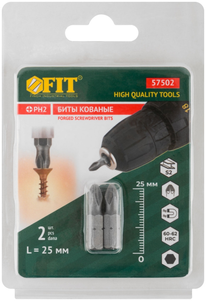 Биты кованые, сталь S2, одностор. 25 мм РН2, 2шт. Профи, блистер