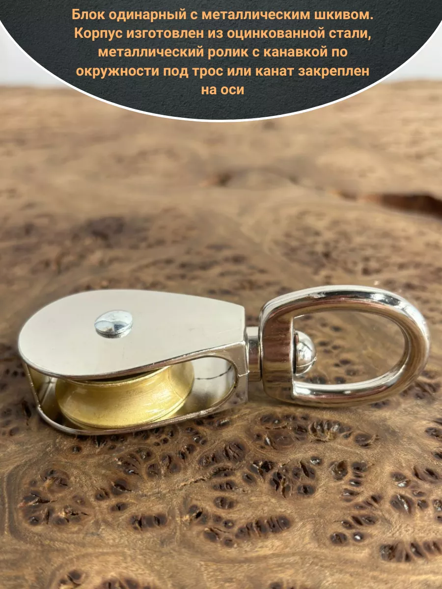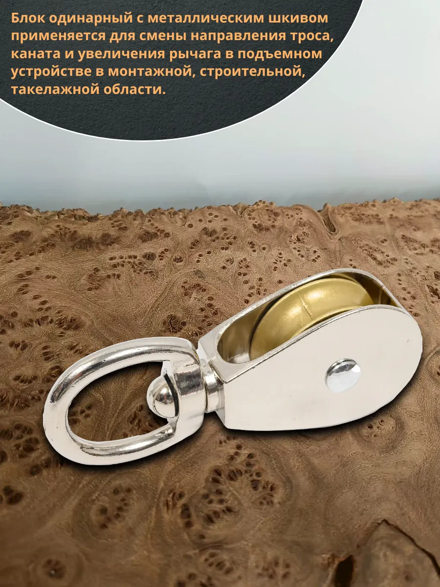 Блок одинарный с металлическим шкивом. Корпус изготовлен из оцинкованной стали, металлический ролик с канавкой по окружности под трос или канат закреплен на оси. Применяют в монтажных, строительных и такелажных работах как средство изменения направления движения троса с целью увеличения грузоподъемности при меньших усилиях на подъем. Не предназначен для грузоподъемных работ.