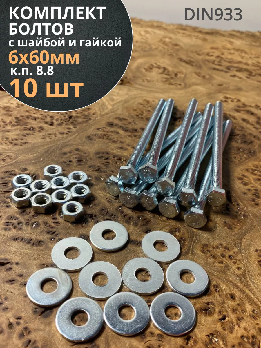 Болт М6х60 мм оцинкованный к.п.8.8 с шайбой и гайкой, 10 шт