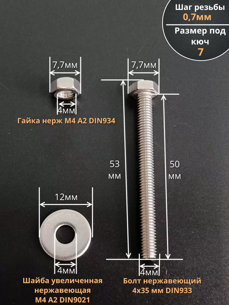 Болт нержавеющий 4х50 мм DIN933 с гайкой и шайбой, 10шт.