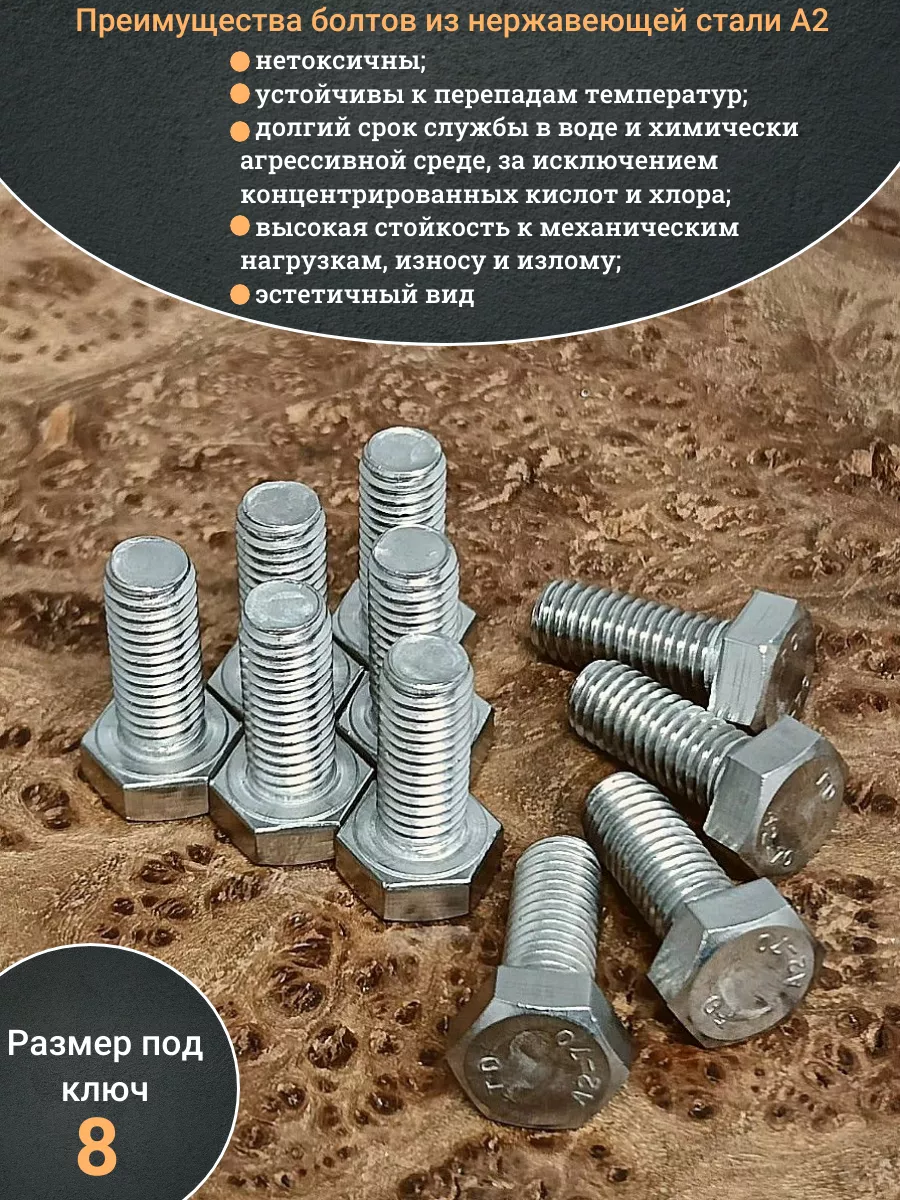 Материалом для болта служит нержавеющая сталь класса A2. У изделия есть цилиндрический стержень c полной резьбой М5 и шестигранная головка. Шляпка передает крутящий момент от ключа к крепежу при завинчивании. Для создания прочных резьбовых соединений крепеж используется в комбинации с шайбой и гайкой или завинчивается в отверстия с нарезанной резьбой. Чтобы исключить электрохимическую коррозию, шайбы с гайкой делаются из коррозионно-устойчивой стали либо нейтральных полимерных материалов.