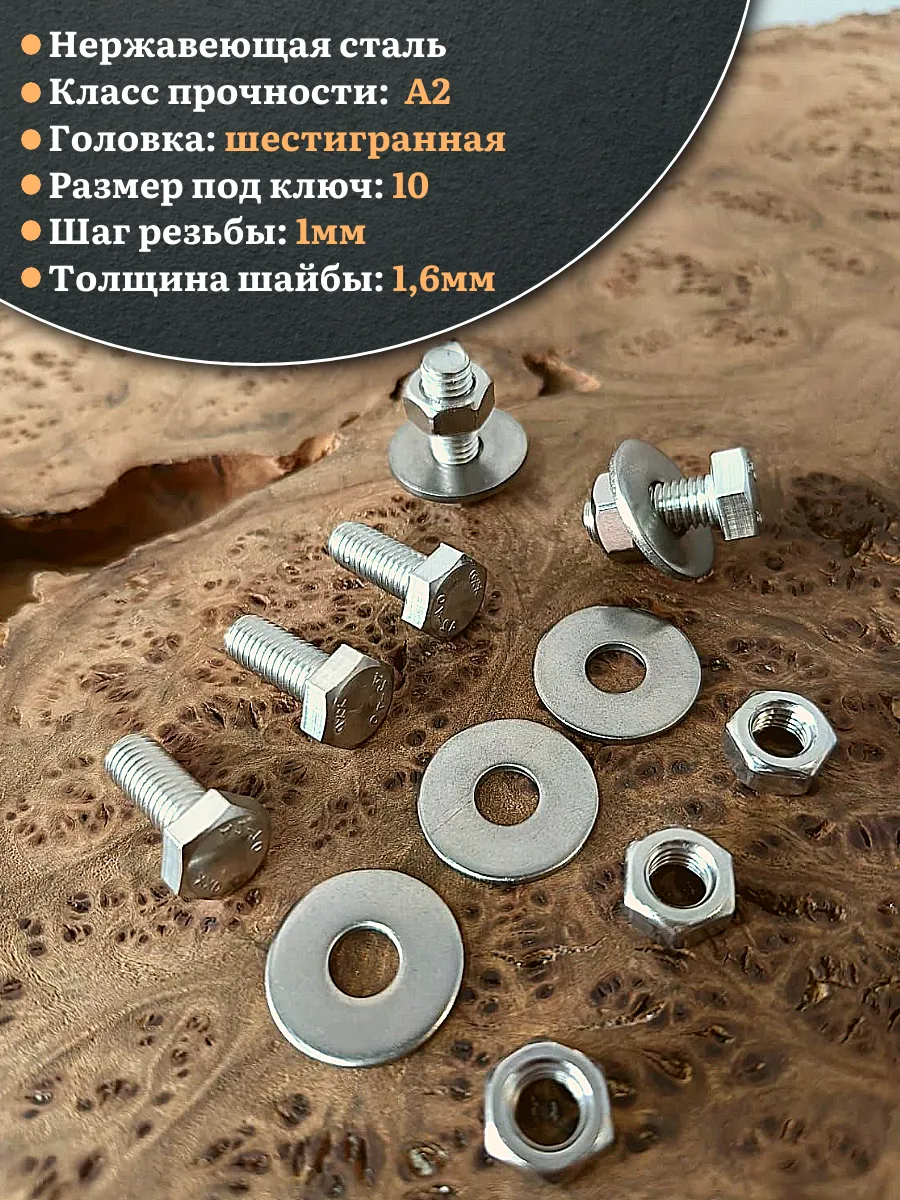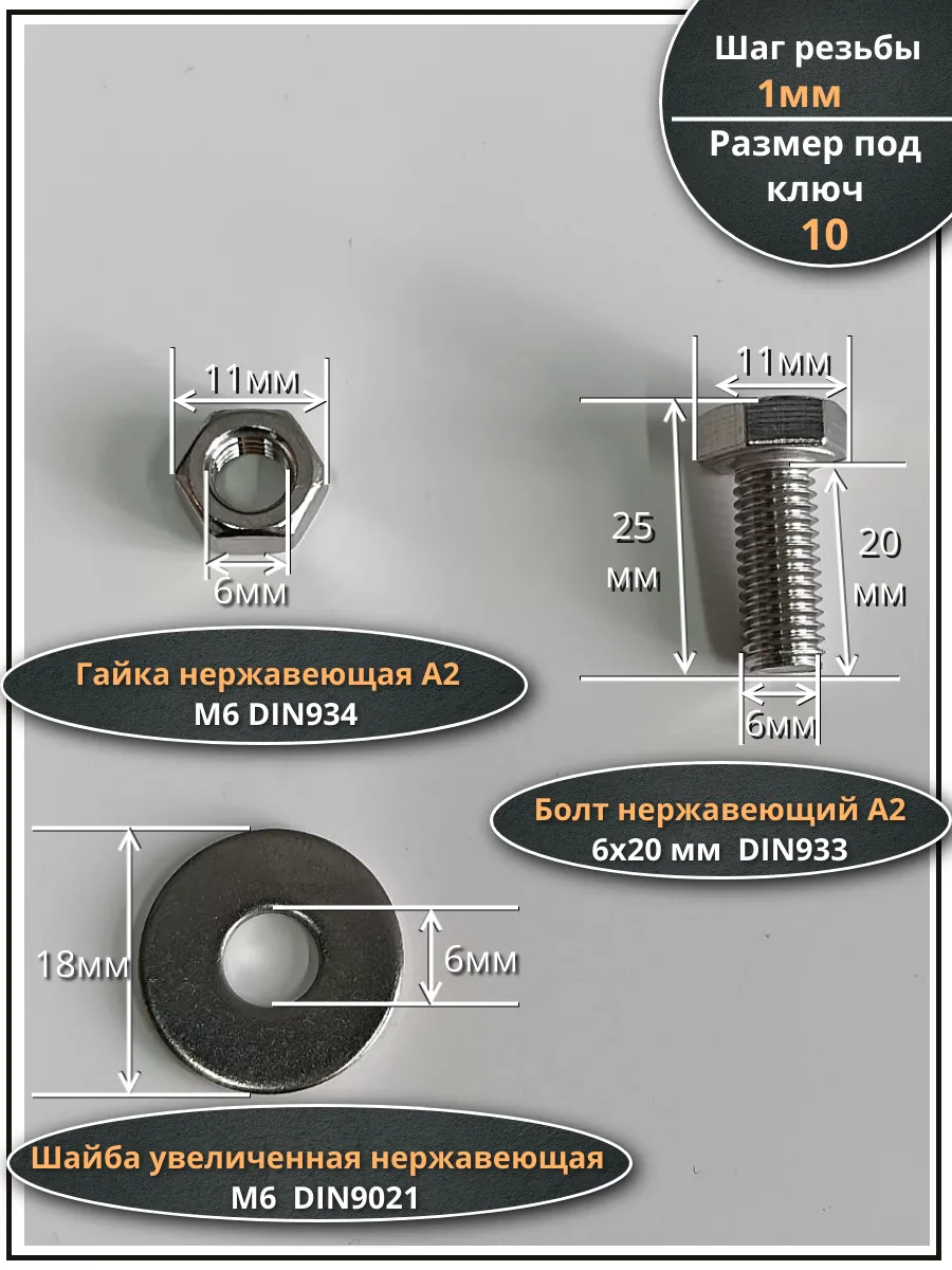 | Болт нержавеющий 6х20 мм DIN933 с гайкой и шайбой, 10шт. | 33333 | 1 шт. |