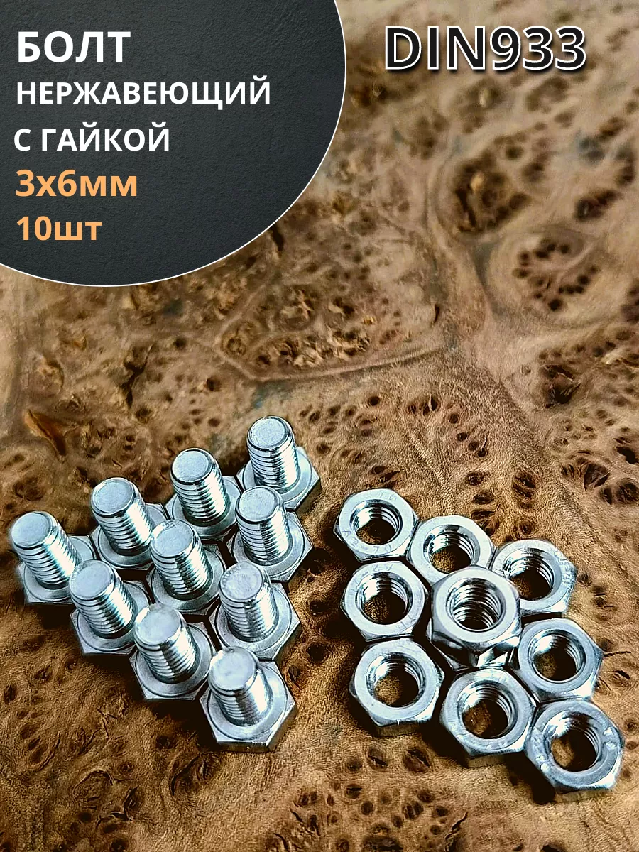 Болт нержавеющий М3х6 мм DIN 933 с гайкой , 10 шт.