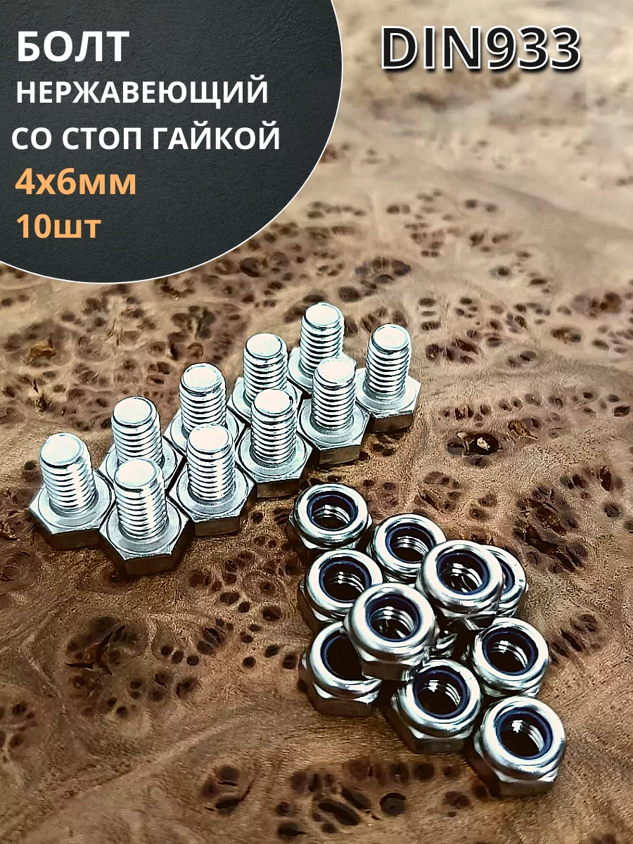 Болт нержавеющий М4х6 мм DIN 933 с гайкой , 10 шт.