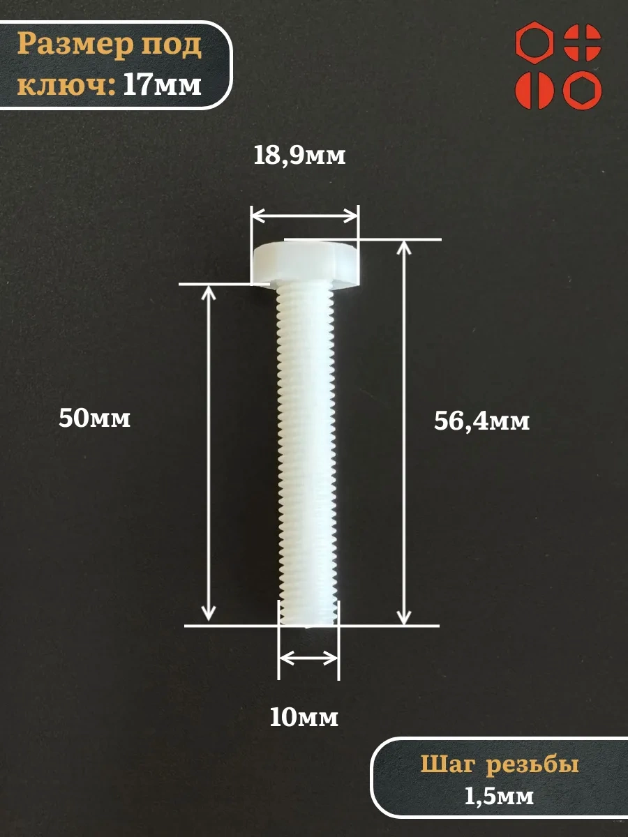 | Болт полиамидный 10х50 мм DIN 933 (пластик), 50 шт. | бп1050933ф50 | 1 шт. |