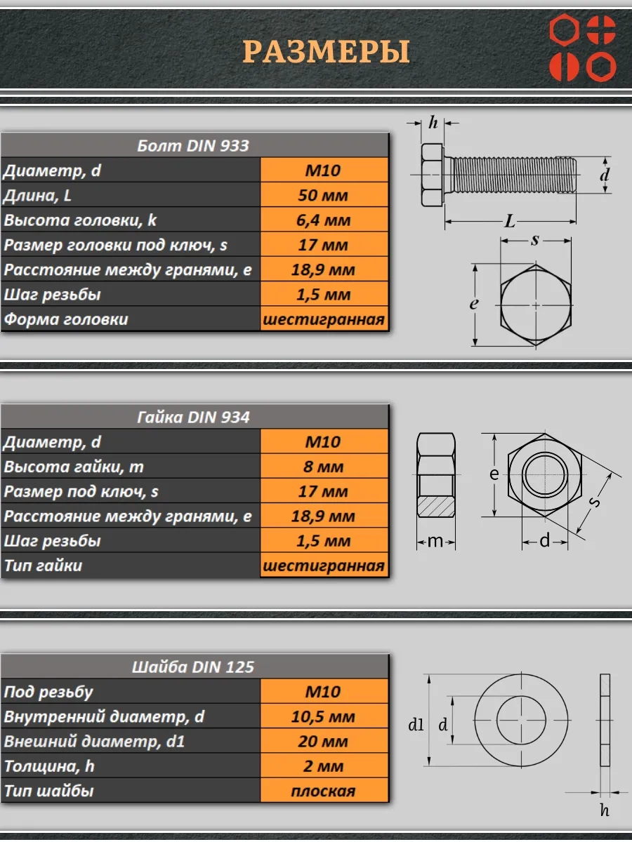 | Болт полиамидный 10х50 мм DIN 933 с гайкой и шайбой, по 10 шт. | бп1050933наборГШф10 | 1 шт. |