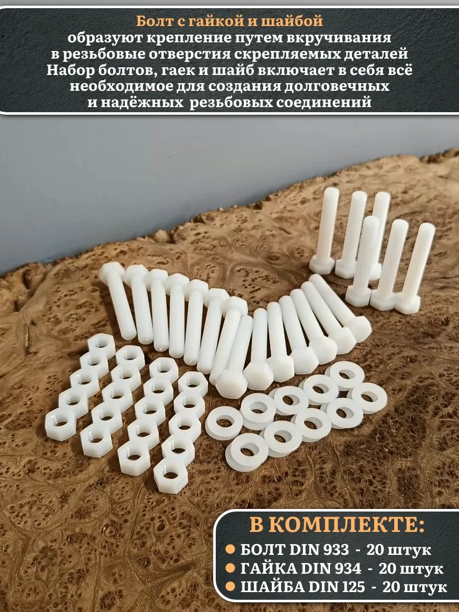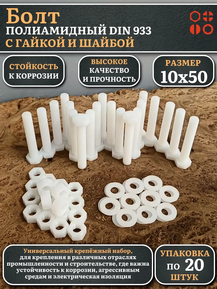 Болт полиамидный 10х50 мм DIN 933 с гайкой и шайбой, по 20 шт.