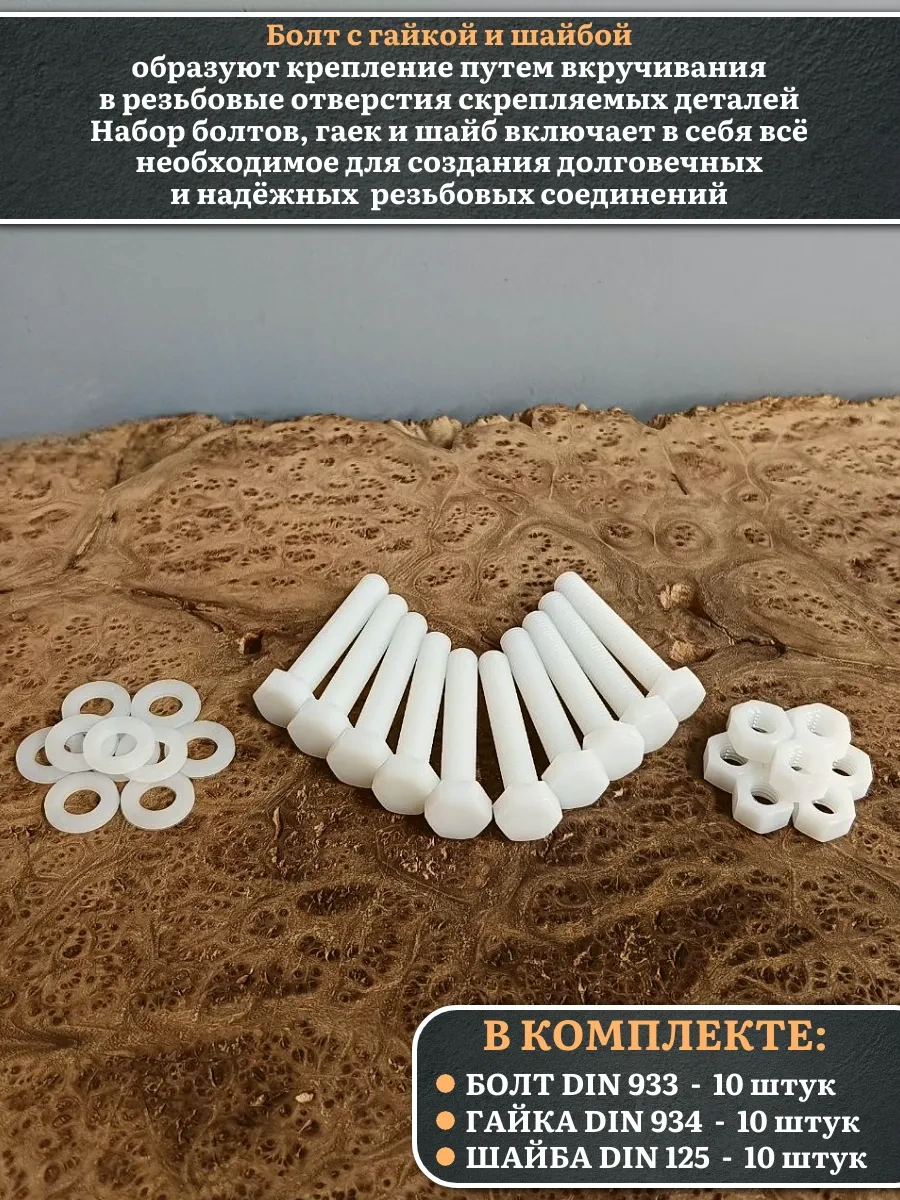 Болт полиамидный 10х60 мм DIN 933 с гайкой и шайбой, по 10 шт.