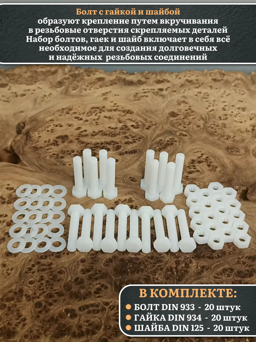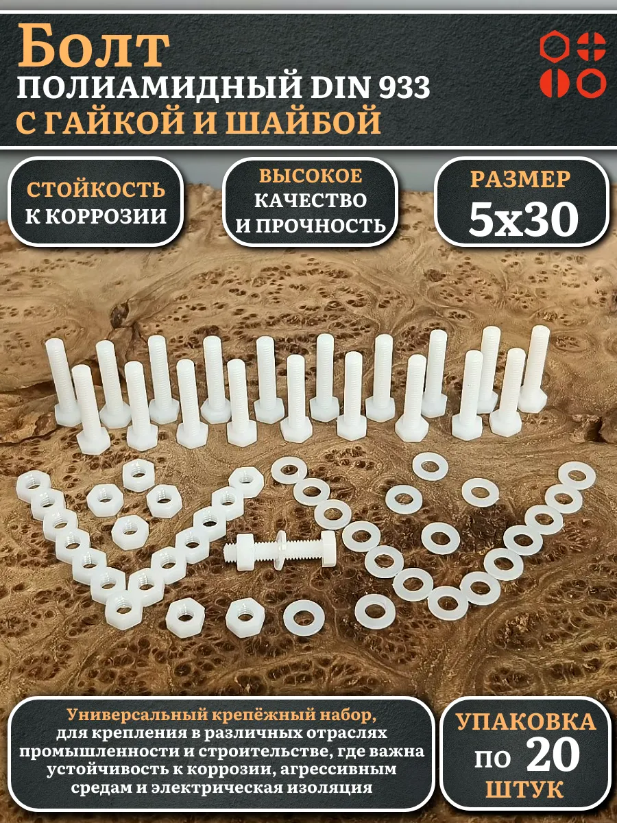 | Болт полиамидный 5х30 мм DIN 933 с гайкой и шайбой, по 20 шт. | бп530933наборГШф20 | 1 шт. |
