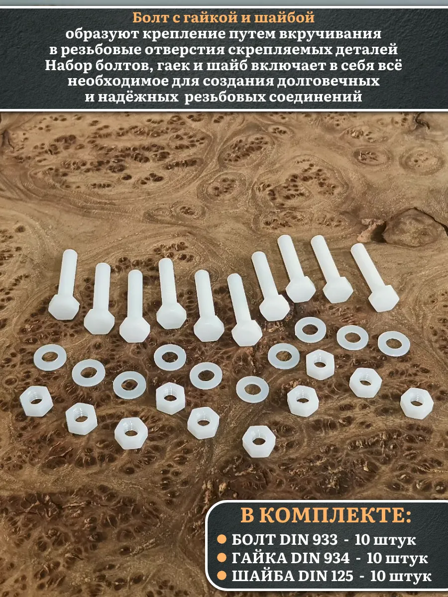 | Болт полиамидный 5х30 мм DIN 933 с гайкой и шайбой, по 10 шт. | бп530933наборГШф10 | 1 шт. |