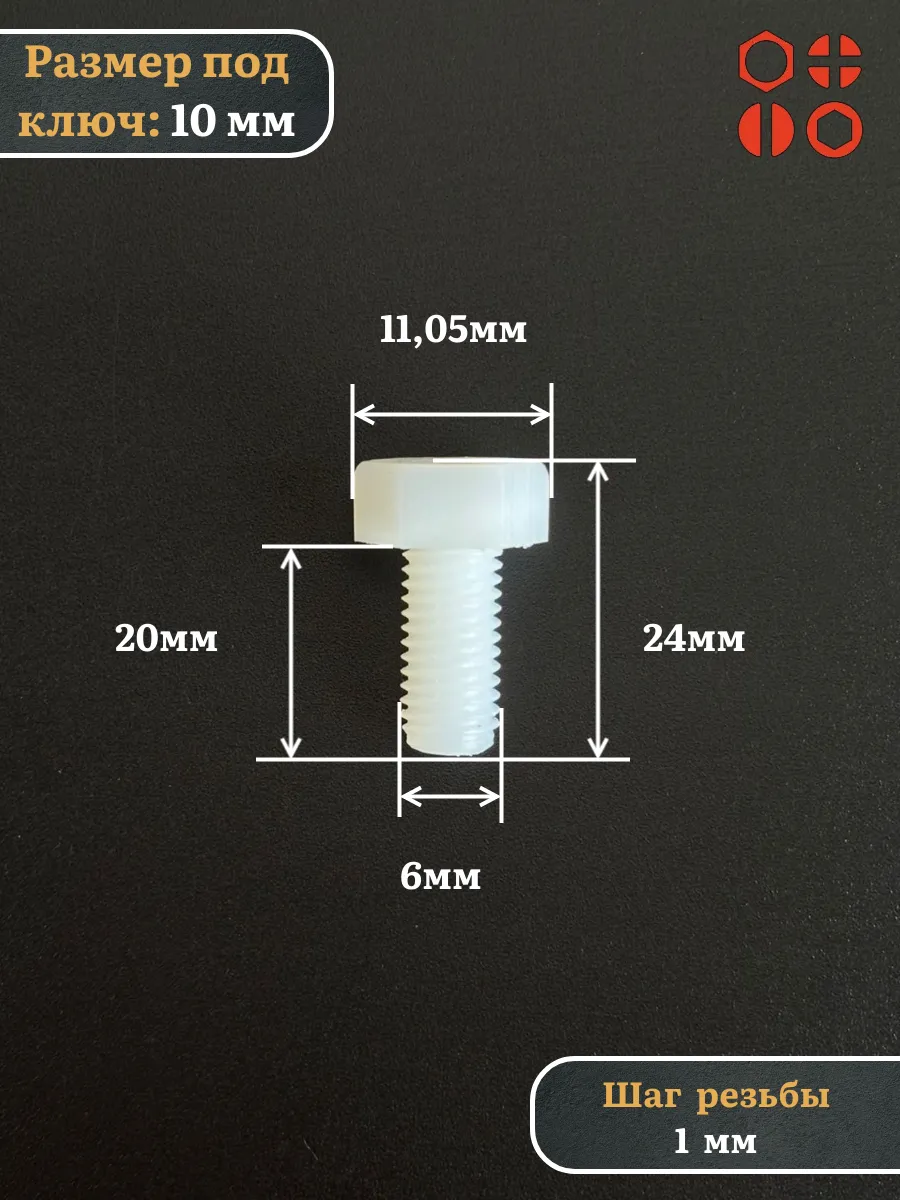 Болт полиамидный 6х20 мм DIN 933 (пластик), 10 шт.