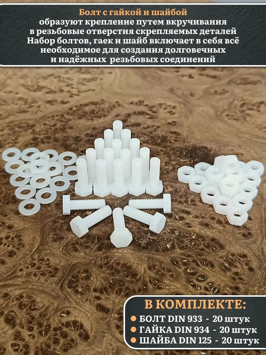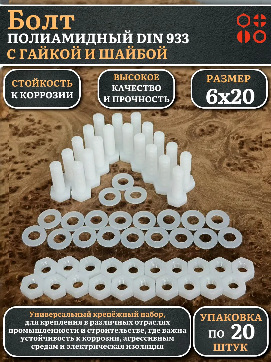 | Болт полиамидный 6х20 мм DIN 933 с гайкой и шайбой, по 20 шт. | бп620933наборГШф20 | 1 шт. |