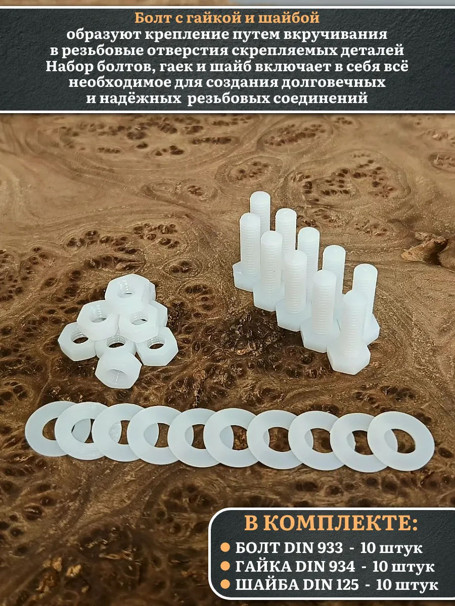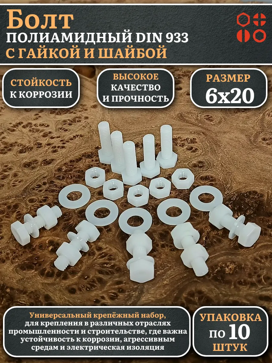 | Болт полиамидный 6х20 мм DIN 933 с гайкой и шайбой, по 10 шт. | бп620933наборГШф10 | 1 шт. |