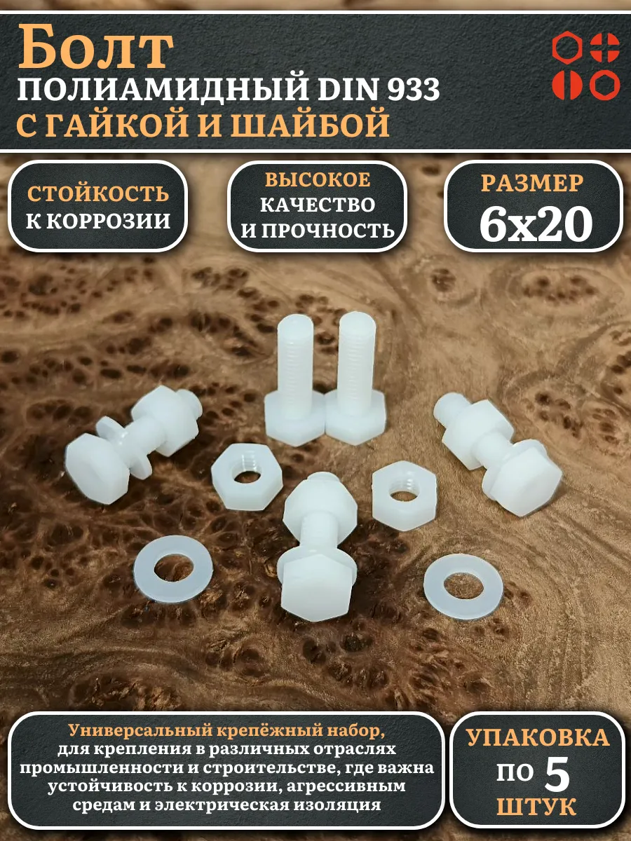 | Болт полиамидный 6х20 мм DIN 933 с гайкой и шайбой, по 5 шт. | бп620933наборГШф5 | 1 шт. |