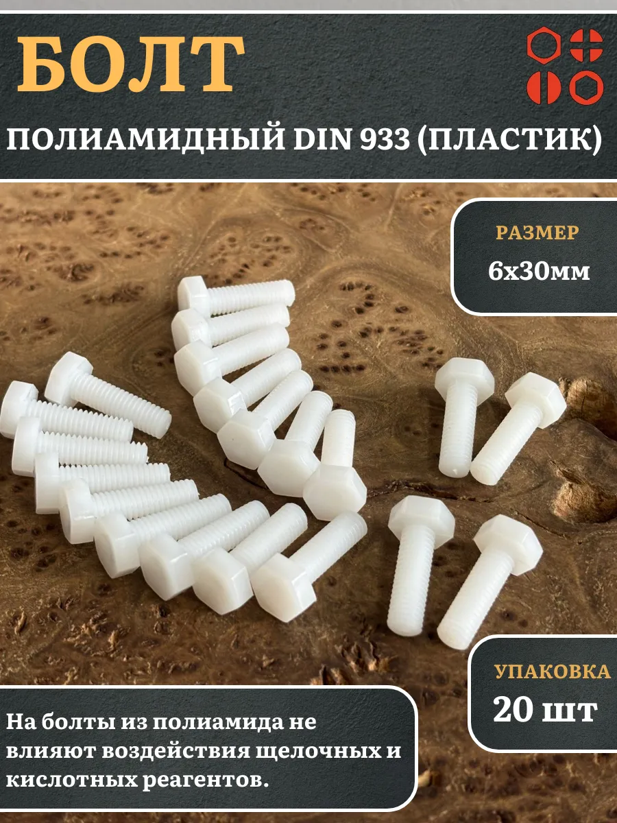 | Болт полиамидный 6х30 мм DIN 933 (пластик), 20 шт. | бп630933ф20 | 1 шт. |