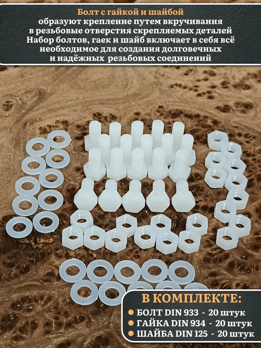 Болт полиамидный 8х10 мм DIN 933 с гайкой и шайбой, по 20 шт.