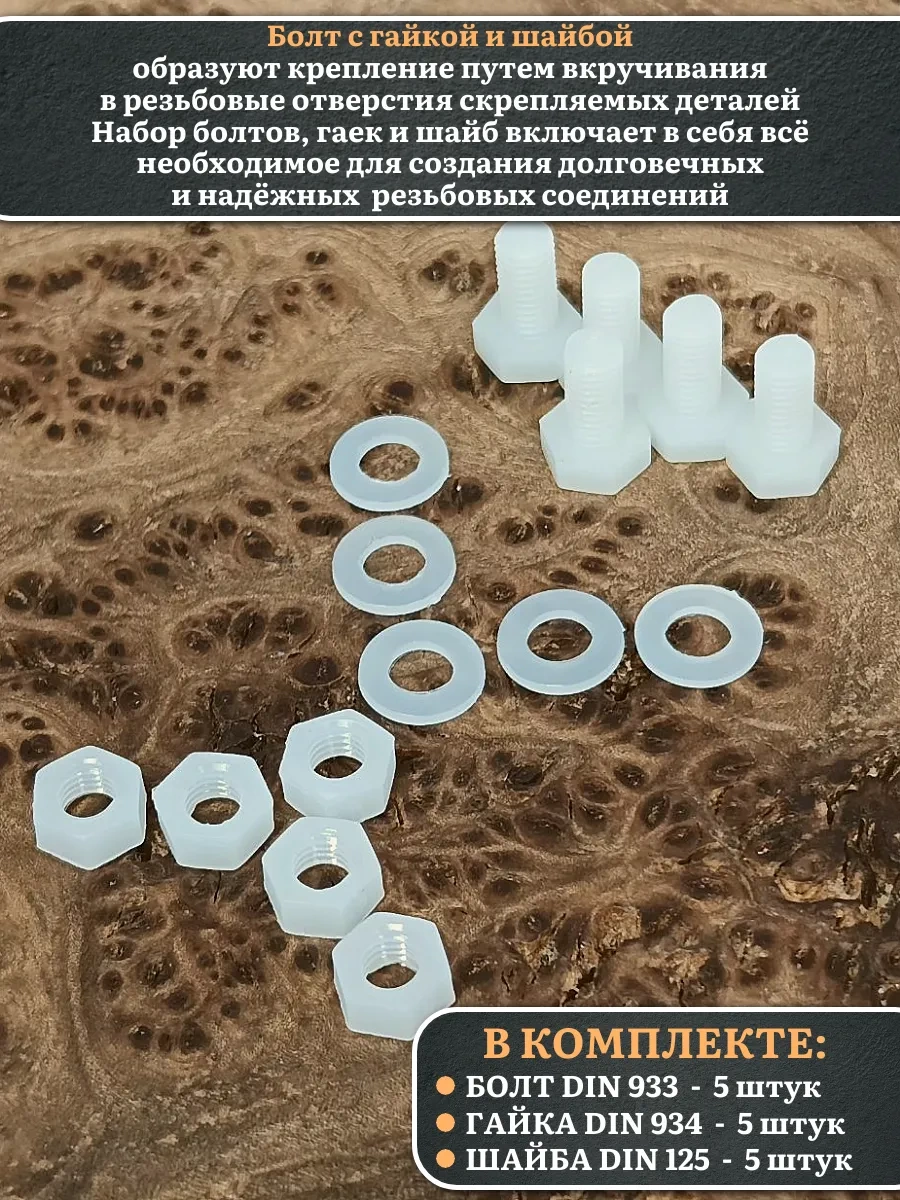 Болт полиамидный 8х10 мм DIN 933 с гайкой и шайбой, по 5 шт.