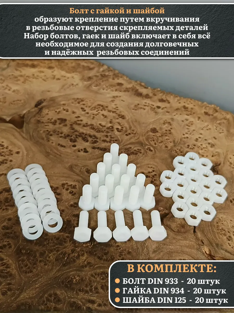 | Болт полиамидный 8х20 мм DIN 933 с гайкой и шайбой, по 20 шт. | бп820933наборГШф20 | 1 шт. |
