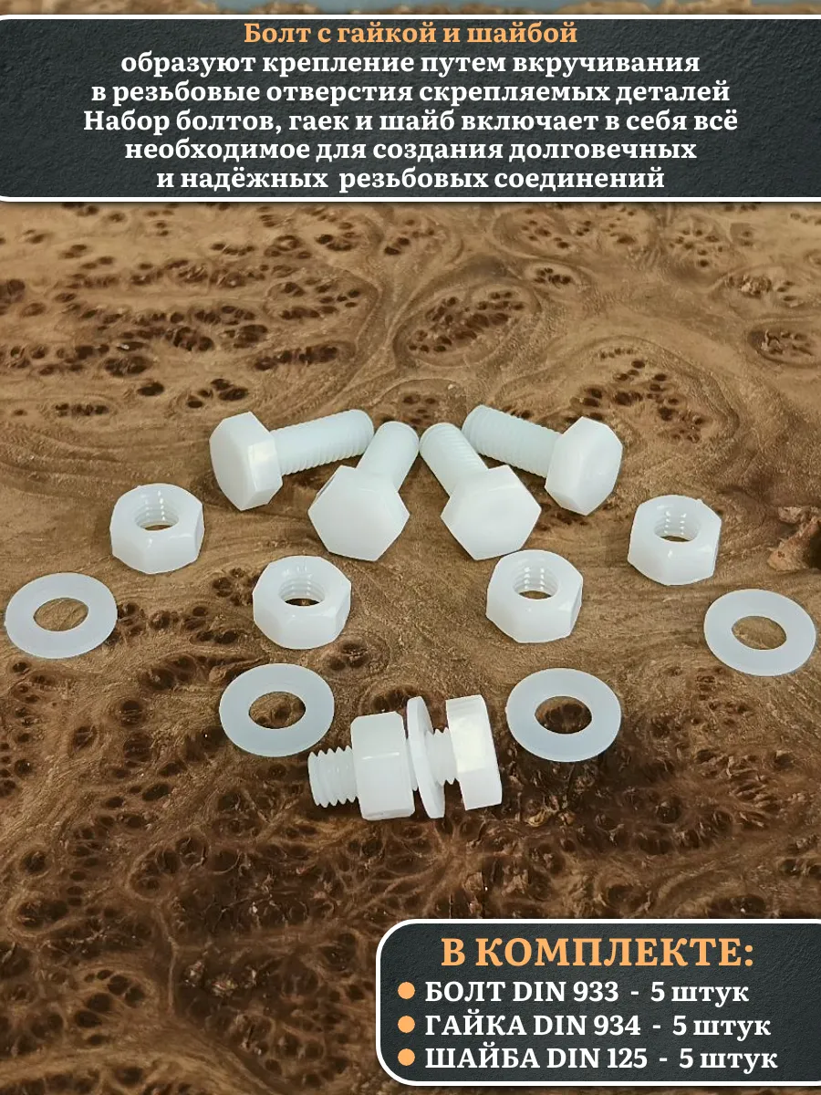 | Болт полиамидный 8х20 мм DIN 933 с гайкой и шайбой, по 5 шт. | бп820933наборГШф5 | 1 шт. |