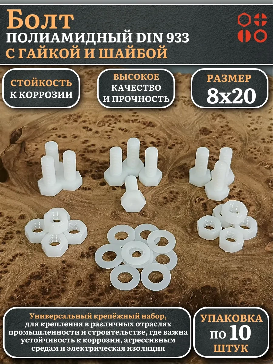 | Болт полиамидный 8х20 мм DIN 933 с гайкой и шайбой, по 5 шт. | бп820933наборГШф5 | 1 шт. |