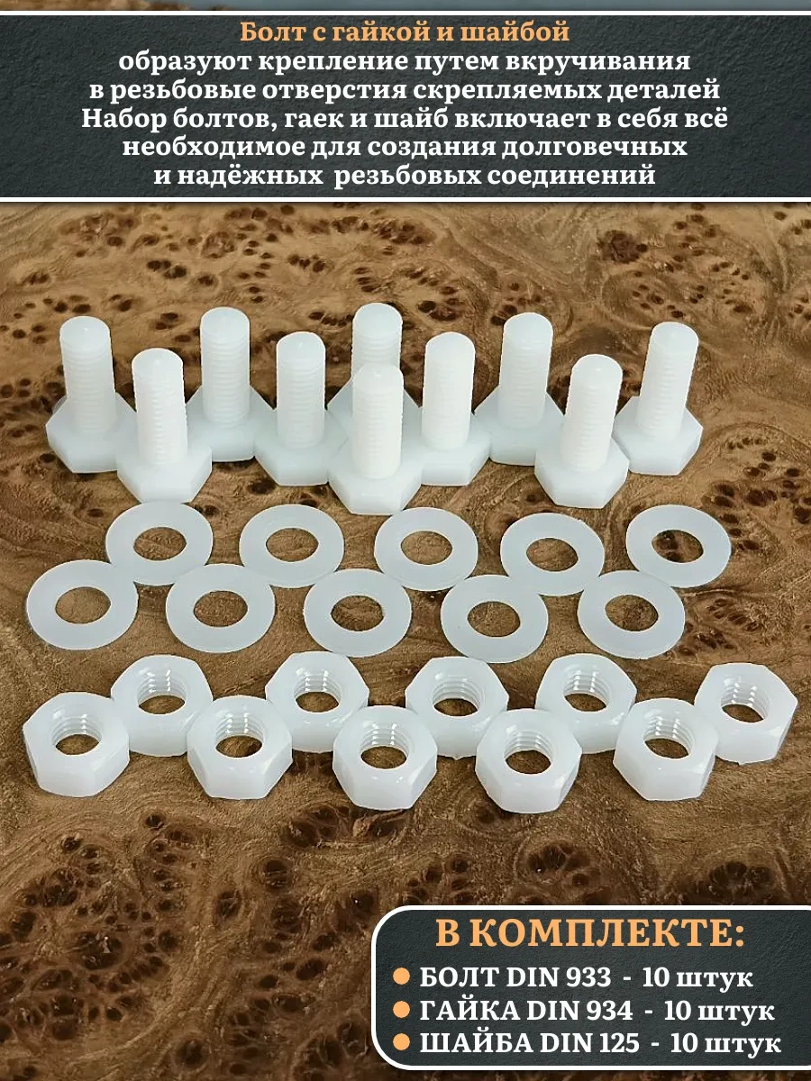 Болт полиамидный 8х20 мм DIN 933 с гайкой и шайбой, по 10 шт.