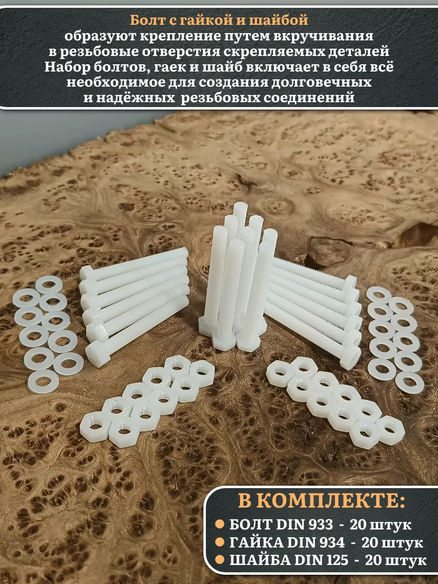 | Болт полиамидный 8х50 мм DIN 933 с гайкой и шайбой, по 20 шт. | бп850933наборГШф20 | 1 шт. |
