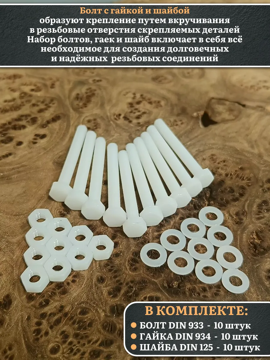 | Болт полиамидный 8х50 мм DIN 933 с гайкой и шайбой, по 10 шт. | бп850933наборГШф10 | 1 шт. |