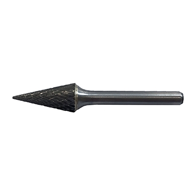 Борфреза коническая представляет собой оснастку с двойной насечкой для работы по металлу с пневматическим и электрическим инструментом. Форма фрезы позволяет работать с прямыми и коническими отверстиями, проводить обработку прямых металлических поверхностей и кромок, делать насечки и сверлить отверстия с ограниченным усилием. Твердосплавная часть фрезы прикреплена к стальному хвостовику для установки в инструмент. Форма данной борфрезы твердосплавной конической с двойной насечкой предполагает применение для обработки сопряжений и снятия сварных усилений. Диаметр головки 12 мм, диаметр хвостовика 6 мм, тип формы M.