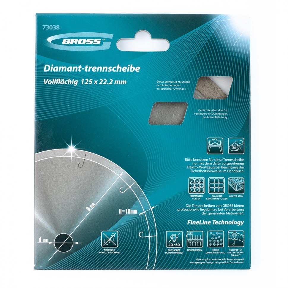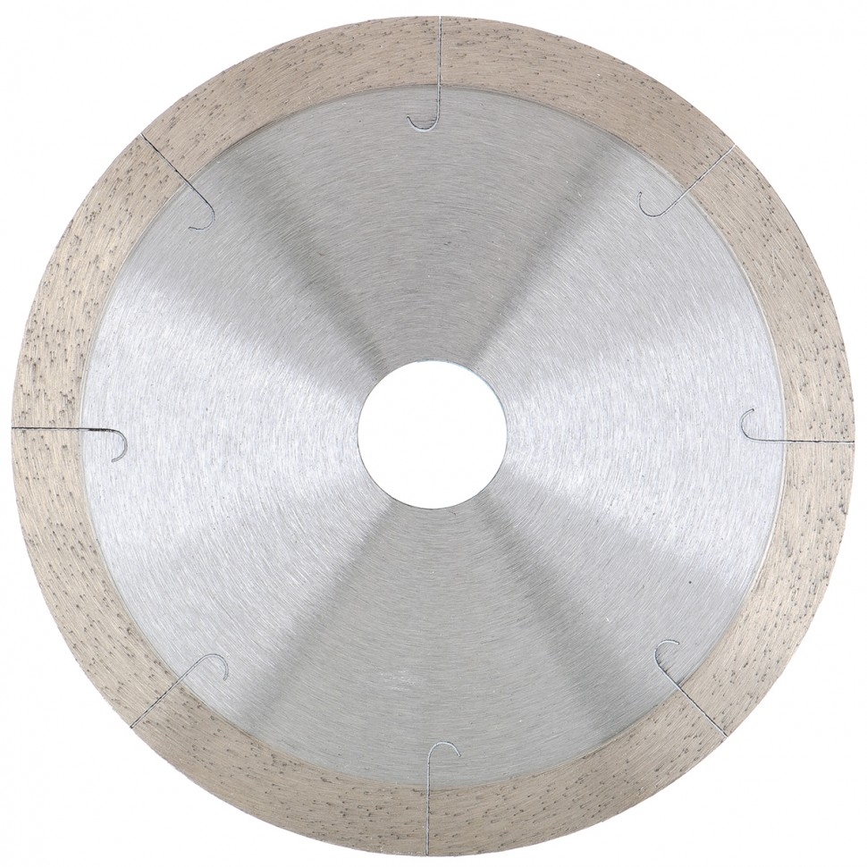 Сплошной алмазный диск Gross ф125х22,2 мм 73038 с лазерной перфорацией для мокрого резания используется в качестве расходника на УШМ или плиткорезах с посадочным размером 22,2 мм. Оптимальное соотношение серебра, кобальта и других качественных компонентов в металлической связке позволяет работать с гранитом, керамикой, керамогранитом, мрамором, натуральным и искусственным камнем. Метод мокрого шлифования подразумевает использование водяного охлаждения, что способствует снижению перегрева и эффективному отводу пыли.Преимущества Диск имеет большой ресурс, надежность и может использоваться профессионально, т.к. изготовлен по технологии горячего прессования. За счет сплошного типа диска обеспечивается качественный ровный срез без риска образования сколов. Высокая концентрация и крупный размер алмазов 40-50 мкм повышают скорость реза. Лазерная перфорация усиливает охлаждение диска, а значит, он легко выдерживает интенсивное использование. Режущая часть шириной 10 мм гарантирует стабильно высокую производительность