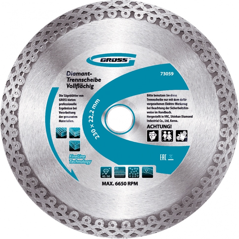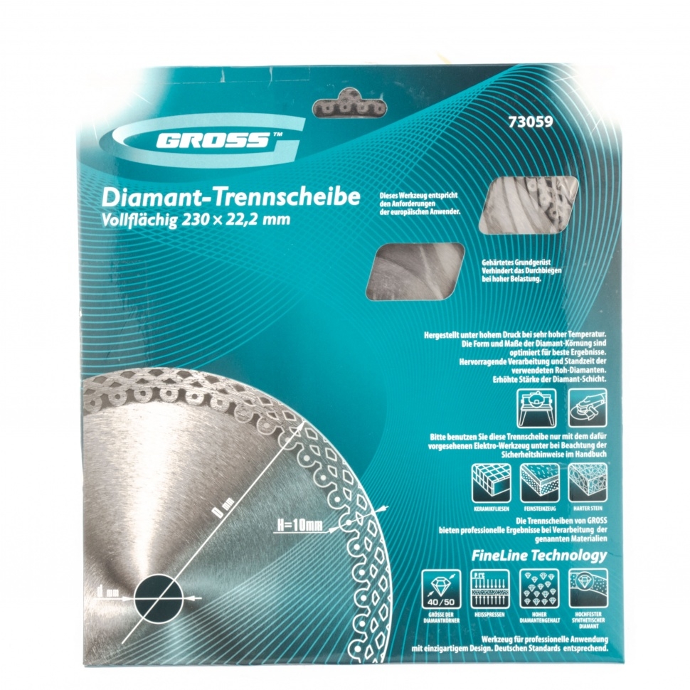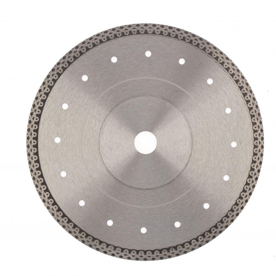 Тонкий сплошной алмазный диск Gross Jaguar ф230х22,2 мм 73059, мокрое резание, подходит для профессионального использования с УШМ или плиткорезами соответствующего типоразмера. Он используется для резки мокрым методом твердых материалов: гранита, керамогранита, плитки, мрамора и камня. Диск оставляет ровный срез без трещин и сколов за счет сплошной формы. При мокрой резке вода охлаждает диск и удаляет пыль с рабочей зоны, поэтому он легко справляется с большими объемами работ. Тонкий диск 1,2 мм значительно увеличивает скорость реза.Преимущества Продуманная форма рабочей части не только позволяет проводить мокрое шлифование, но и допускает кратковременное сухое резание материалов. В процессе изготовления диска используется горячее прессование, исключающее изъяны и гарантирующее точную форму. Высокая концентрация алмазов размером 40-50 мкм на широкой режущей части (10 мм) увеличивает производительность независимо от скорости реза. Качественные компоненты связки (кобальт, серебро и др.) обеспечивают высокий рес