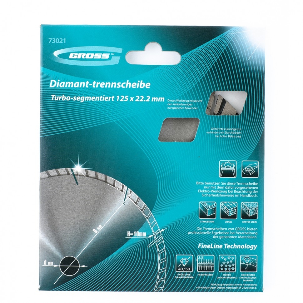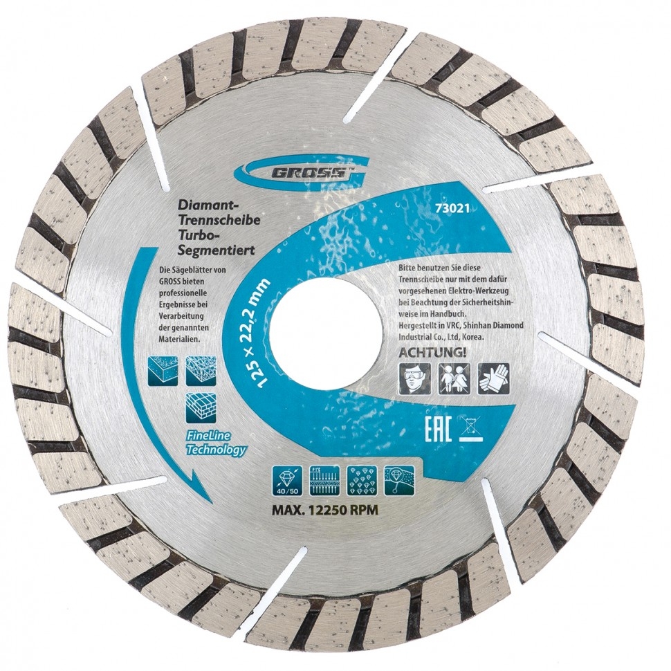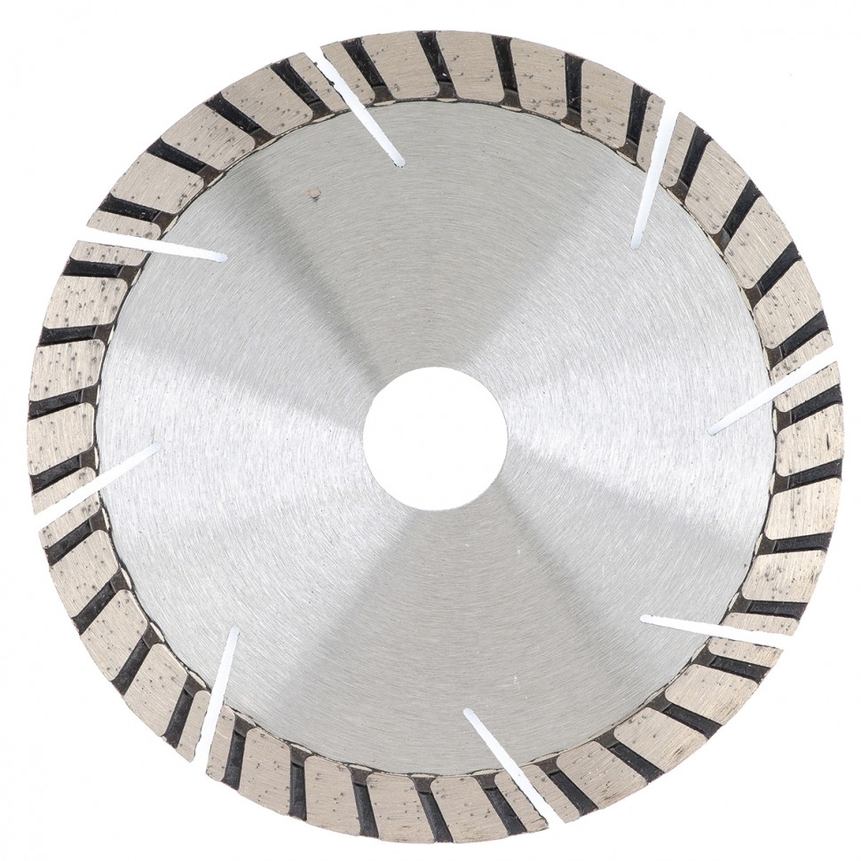 Алмазный турбо-сегментный диск Gross ф125х22,2 мм 73021 для сухого резания устанавливается на УШМ в качестве оснастки для проведения отрезных работ. Диск с турбированной рабочей частью универсален по своему применению и его можно использовать для резки камня, гранита и кирпича, свежего бетона, а также слабоармированного железобетона. Он пригодится для интенсивных работ с профессиональным инструментом.Преимущества Турбо-сегментная форма &mdash резание материалов происходит быстро, водяное охлаждение не требуется, в т.ч. армированного бетона. Надежность &mdash диск выполнен методом горячего прессования. Износостойкость и скорость реза до 12250 об/мин &mdash режущая часть выполнена из крупных алмазов размером 40-50 мкм. Рабочая часть 10 мм с высокой концентрацией алмазных зерен &mdash диск идеально подходит для выполнения больших объемов работ. Оптимально подобранная металлическая связка &mdash серебро, кобальт и другие составляющие значительно повышают ресурс диска, позволяют резать материалы разной плотности б