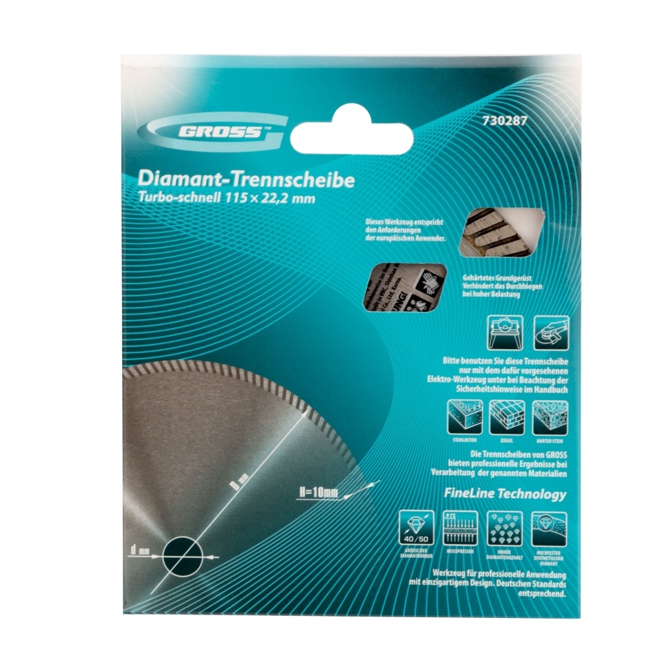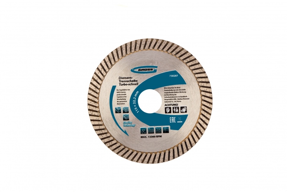 Алмазный диск Gross ф115х22,2мм 730287, турбо, позволяет осуществлять сухое резание бетона, в том числе недавно уложенного, среднеармированного железобетона, кирпича, гранита, камня, песчаника с помощью УШМ. Инструмент подходит для алмазной резки нескольких типов материалов благодаря турбированной рабочей части и оптимальному соотношению компонентов в металлической связке. Высокое качество диска делает его подходящим для профессионального применения.Преимущества Турбированная форма обеспечивает быструю алмазную резку сухим способом, прибегать к водяному охлаждению не нужно. Изготовление диска путем горячего прессования позволяет повысить его надежность и ресурс. Алмазный диск быстро режет материалы и отличается износостойкостью благодаря высокой концентрации алмазов и крупному размеру зерен 40-50 мкм. Широкая рабочая часть (10 мм) позволяет повысить производительность работ. Высококачественная связка из серебра, кобальта и других компонентов со временем истирается, раскрывая новый слой алмазов, поэтому диск