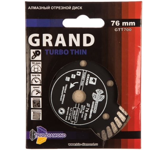 Диск алмазный отрезной турбо ультратонкий по керамограниту Grand hot press (76х10 мм) TRIO-DIAMOND GTT700 предназначен для резки керамогранита, твердой керамики, глазурованной керамической плитки.