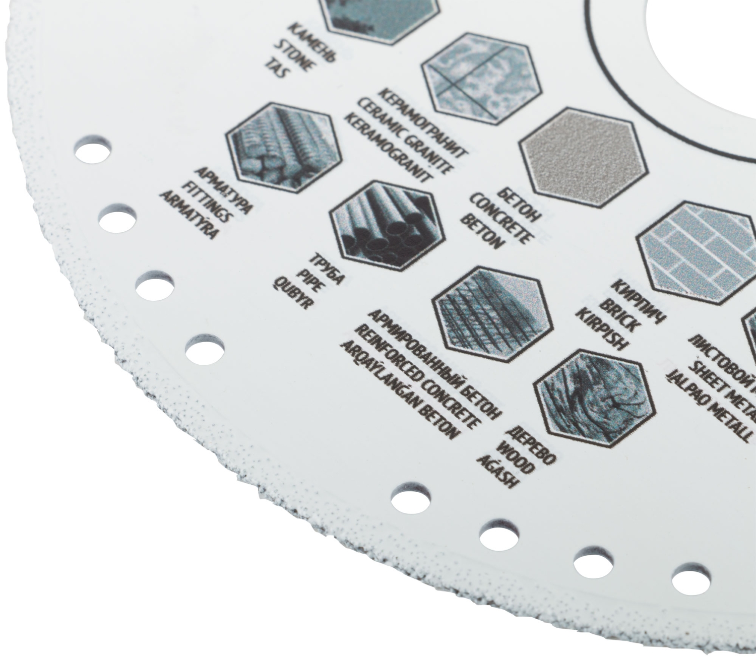 «Мультирез». Универсальный сплошной. Изготовлен по технологии вакуумного спекания. Для сухой и влажной резки. Высокая плотность расположения алмазов в режущем слое позволяет использовать диск для резки бетона, кирпича, гранита, мрамора и камня, арматуры, металлического профиля. Посадочный диаметр 22,2 мм. Материал: термообработанная высокоуглеродистая инструментальная сталь, режущая кромка содержит порошок из=технических алмазов. Упаковка: блистер.