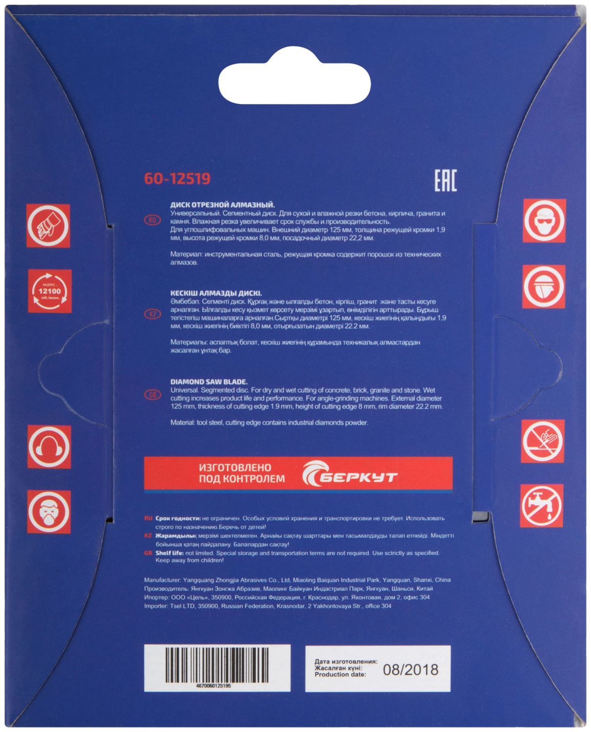 Сегментный. Универсальный. Для сухой и влажной резки бетона, кирпича, гранита, мрамора и камня. Посадочный диаметр 22,2 мм. <br/>Материал: инструментальная сталь, режущая кромка содержит порошок из технических алмазов. <br/>Упаковка: картонный конверт.