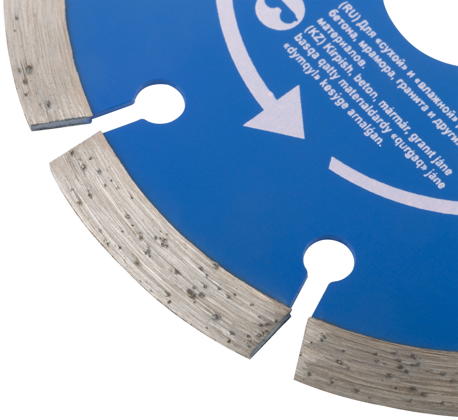 Сегментный. Для использования с УШМ . Посадочный диаметр 22,2мм. Для "сухой" и "влажной"резки кирпича, бетона, мрамора,гранита и других твердых материалов. Сегментная режущая кромка обеспечивает охлаждение диска в процессе работы, предотвращая его перегрев. Материал: инструментальная сталь, режущая кромка-расплав с техническими алмазами. Уп: Блистер