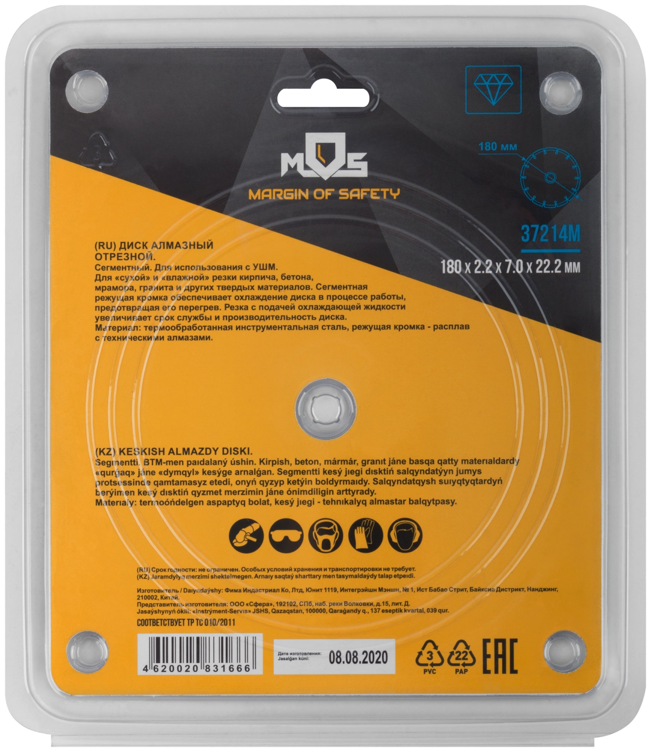 Сегментный. Для использования с УШМ . Посадочный диаметр 22,2мм. Для "сухой" и "влажной"резки кирпича, бетона, мрамора,гранита и других твердых материалов. Сегментная режущая кромка обеспечивает охлаждение диска в процессе работы, предотвращая его перегрев. Материал: инструментальная сталь, режущая кромка-расплав с техническими алмазами. Уп: Блистер
