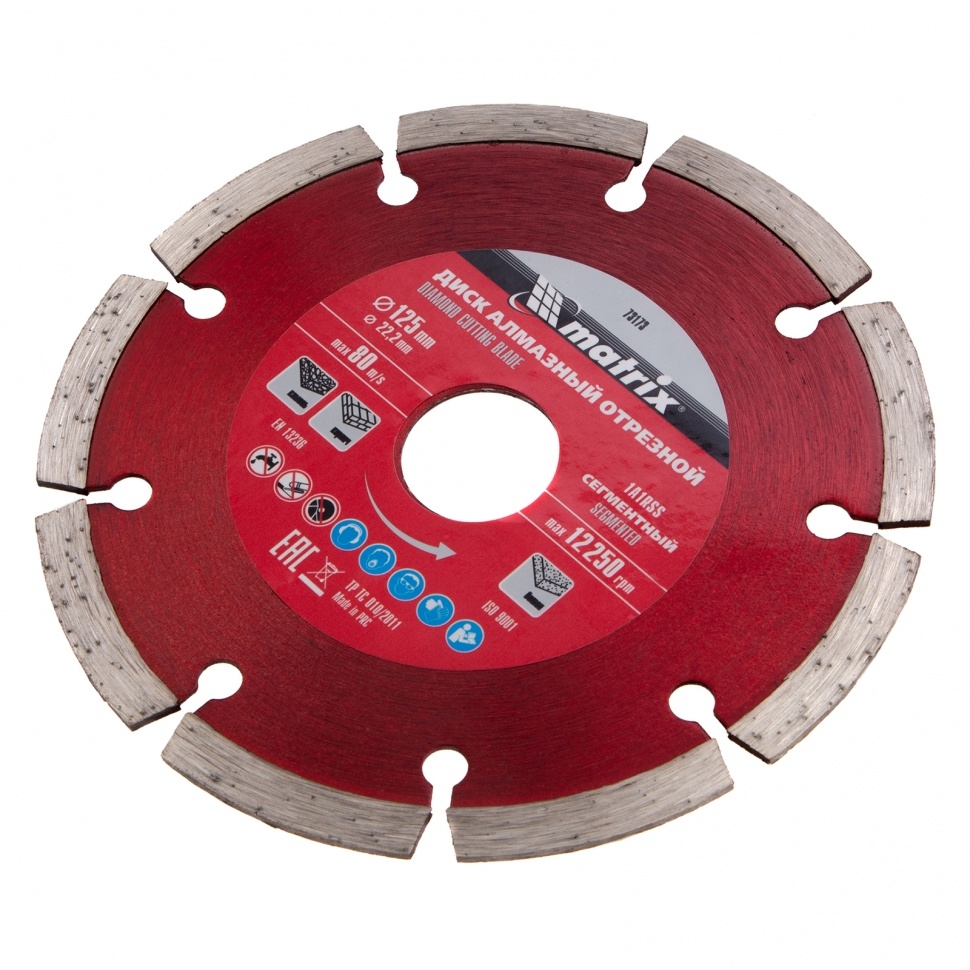 Отрезной алмазный диск Matrix 73173, 125 х 22,2 мм, предназначен для сухой резки натурального и искусственного камня, кирпича, свежего и твердого бетона. Он применяется с углошлифовальными машинами соответствующего типоразмера. Благодаря высокой скорости реза диск позволяет выполнять работы большого объема. Он пригодится на небольших строительных площадках и будет идеальным помощником при решении бытовых задач.Преимущества Увеличенный рабочий ресурс &mdash диск отличается оптимально подобранной металлической связкой и высокой концентрацией алмазов. Высокая производительность без водяного охлаждения &mdash ширина рабочей части 7 мм и прорези между сегментами обеспечивают охлаждение и отвод шлама. Устойчивость к нагрузкам &mdash диск изготовлен по технологии холодного прессования и выдерживает сильные механические воздействия.