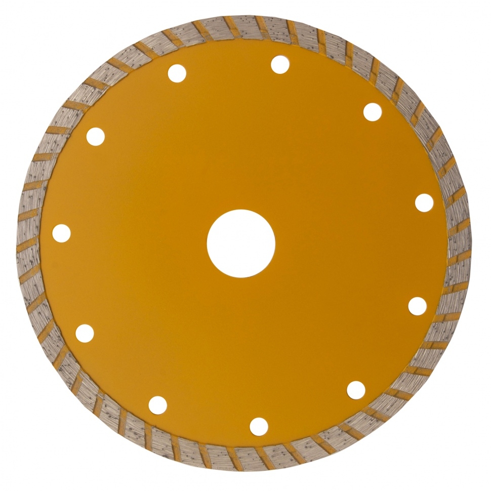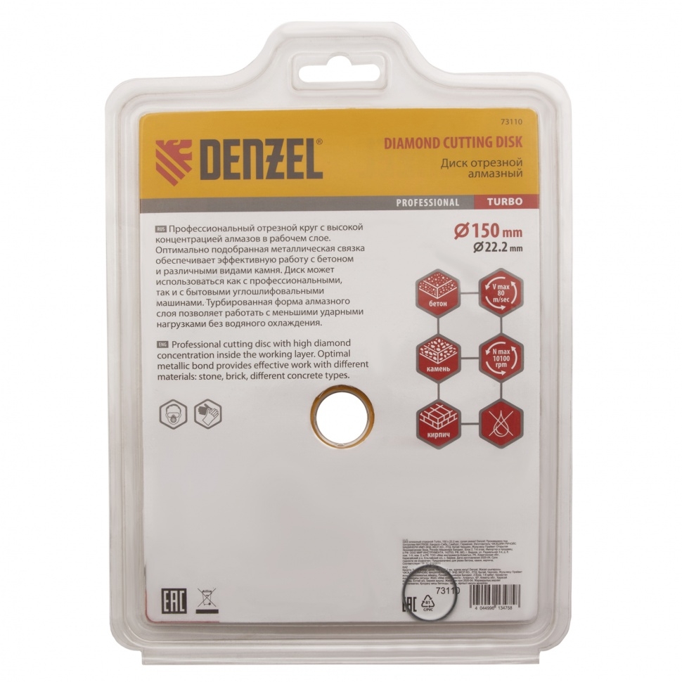 Отрезной алмазный диск Denzel Турбо ф150 х 22,2 мм 73110 рассчитан на сухое резание камня, кирпича, свежего и затвердевшего бетона, железобетона. Он используется в качестве оснастки на УШМ с посадочным отверстием 22,2 мм при проведении бытовых и профессиональных отрезных работ. Турбо диск режет снижает ударную нагрузку при резании материалов и не требует водяного охлаждения.Преимущества Качественная металлическая связка обеспечивает эффективность работы с плотными материалами, т.к. устойчивая к высоким температурам. Режущий слой шириной 7 мм с высокой концентрацией алмазов позволяет увеличить скорость реза и износостойкость диска. Диск изготовлен по технологии холодного прессования, поэтому отличается хорошими режущими свойствами.