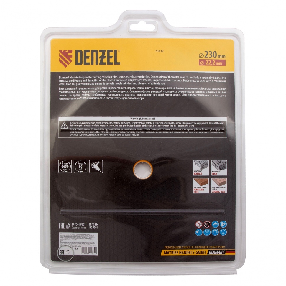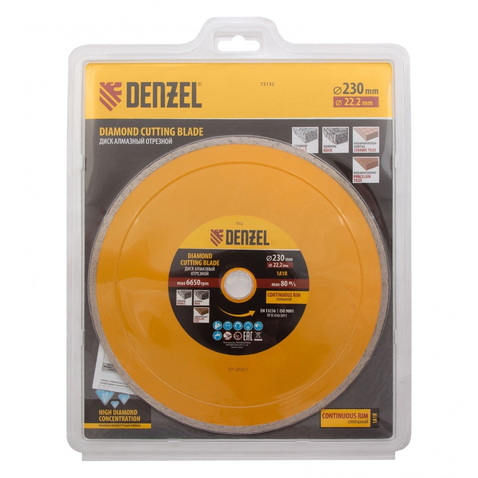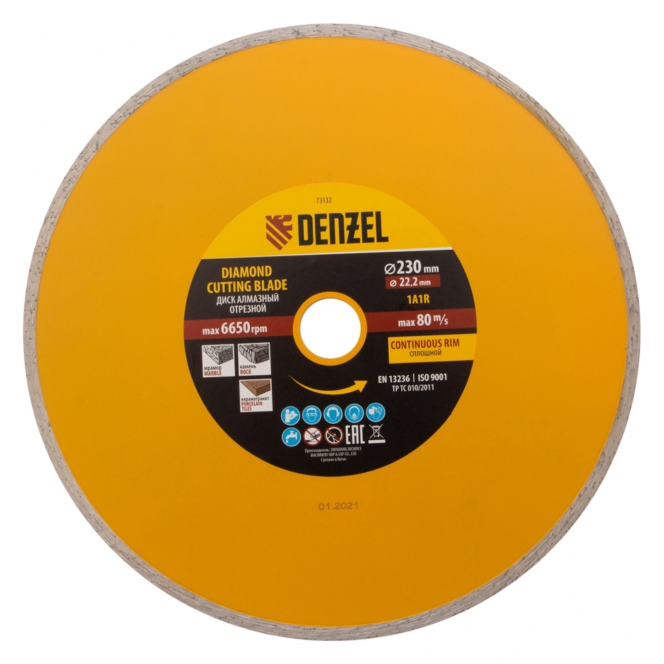 Отрезной алмазный диск Denzel Сплошной 73132, ф230 х 22,2 мм, используется для мокрого резания совместно с углошлифовальными машинами или плиткорезами с посадочным диаметром 22,2 мм. С его помощью режут камень, мрамор, керамогранитную и керамическую плитку. Диск отличается хорошей производительностью за счет высокой скорости реза, поэтому подходит для профессионального применения.Преимущества Сплошная конструкция обеспечивает эффективное выполнение большого объема работ даже при резании хрупких материалов. Режущая кромка шириной 7 мм позволяет получить аккуратный срез без зазубрин и сколов. Диск обладает высоким рабочим ресурсом благодаря увеличенной концентрации алмазов в рабочем слое. Отрезной диск изготовлен способом холодного прессования.