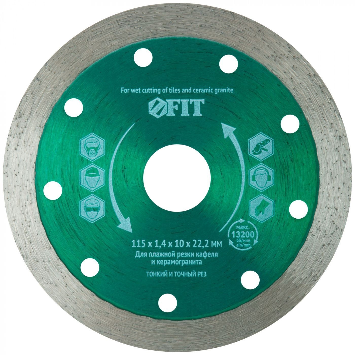 Сплошной. Тонкий рез. Для влажной резки кафеля и керамогранита. Изготовлен по технологии горячего спекания. Высота алмазной режущей<br/>кромки 10 мм. Посадочный диаметр 22,2 мм. Предназначен для углошлифовальных машин. Материал: высокоуглеродистая инструментальная сталь, режущая кромка содержит порошок из технических алмазов. Упаковка: картонный конверт.
