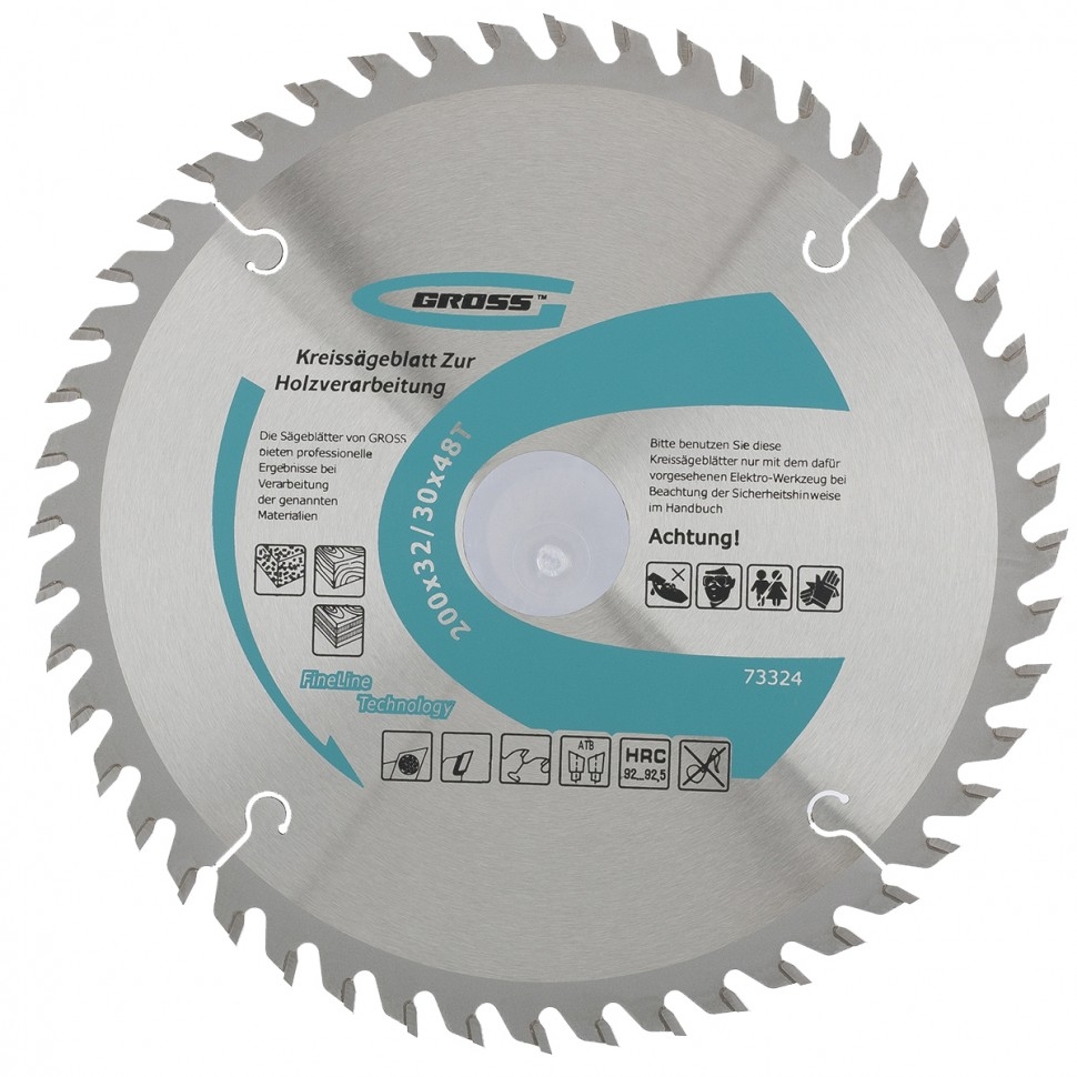 Пильный диск Gross 73324, ф200 х 32 мм, с 48 зубьями и переходным кольцом 32/30 мм предназначен для распила древесины мягких и твердых пород, ДСП, МДФ и фанеры. Является оснасткой для циркулярных и торцовочных пил с посадочным диаметром 32 мм, благодаря универсальному типу зубьев АТВ подходит преимущественно для поперечного реза материалов. Диск изготовлен на высококачественном оборудовании, специально рассчитан на профессиональное применение и выполнение большого объема работ. Преимущества 48 мелких зубьев обеспечивают точный и чистый рез материалов. Кольцо-переходник позволяет самостоятельно изменить посадочный диаметр при необходимости и устанавливать диск на электроинструмент с посадкой 30 мм. Режущие пластины изготовлены из сплава К10 со специальными добавками Ceratizit твердостью 91 HRА, что гарантирует их износостойкость и максимальный рабочий ресурс. В припое содержится значительное количество серебра, он надежно фиксирует твердосплавные пластины к корпусу диска. Режущие кромки прошли многоступенчат