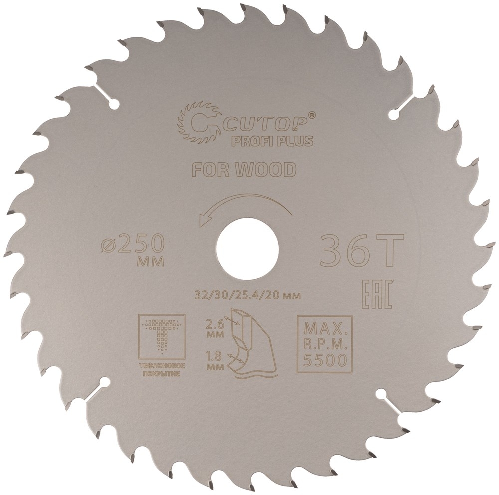 Диск пильный по дереву с тефл.покр.36Т CUTOP Profi Plus 250х1,8/2,6х32/30/25,4/20 мм