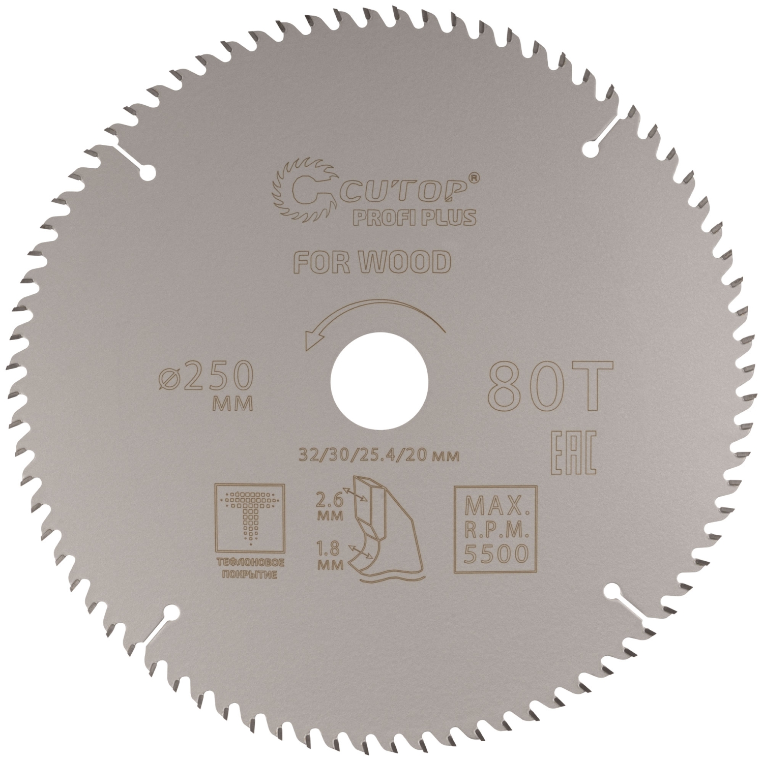 Диск пильный по дереву с тефл.покр.80Т CUTOP Profi Plus 250х1,8/2,6х32/30/25,4/20 мм
