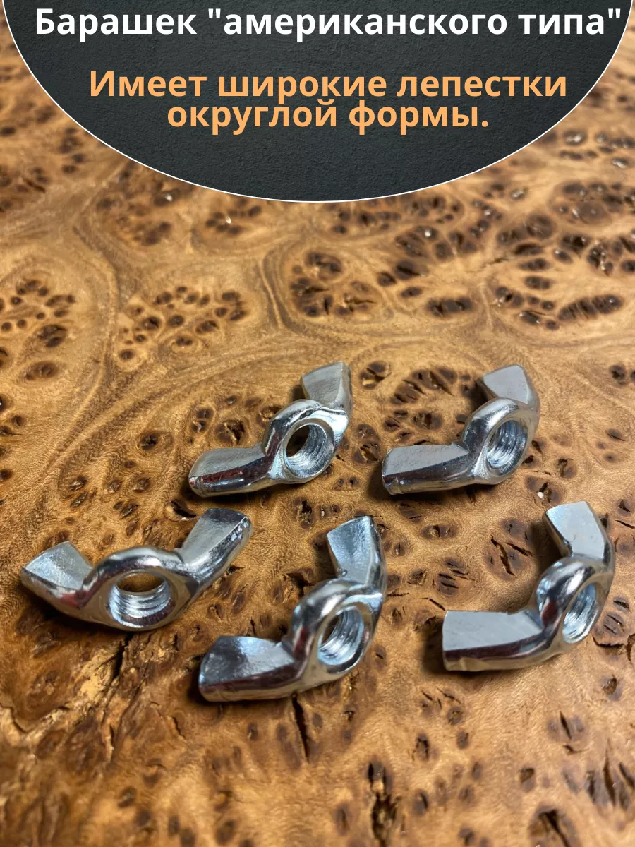 Гайка-барашек – крепежный элемент, имеющий в основе круглое отверстие с метрической резьбой, к которому крепятся два лепестка, вращение которых рукой позволяет затягивать или ослаблять крепление. Потребность в таком крепеже возникает в тех случаях, когда необходимо быстро затянуть или отпустить резьбу крепежа съемной детали, не являющейся элементом несущих конструкций. Изготавливается из оцинкованной или нержавеющей стали.