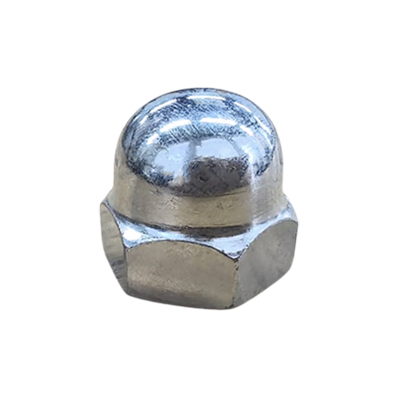 Колпачковая гайка представляет собой сочетание обычной шестигранной гайки и сферического колпачка и предусматривает 2 конструкции – сферические и более плоские. Они различаются между собой глубиной колпачка. Они применяются везде, где требуется красивое и надежное резьбовое соединение. Гайки производятся из углеродистой стали ( с покрытием и без), нержавейки, латуни, алюминия. Стандартом DIN 1587 допускается обработка поверхности гаек для создания защитного никелевого или цинкового слоя.